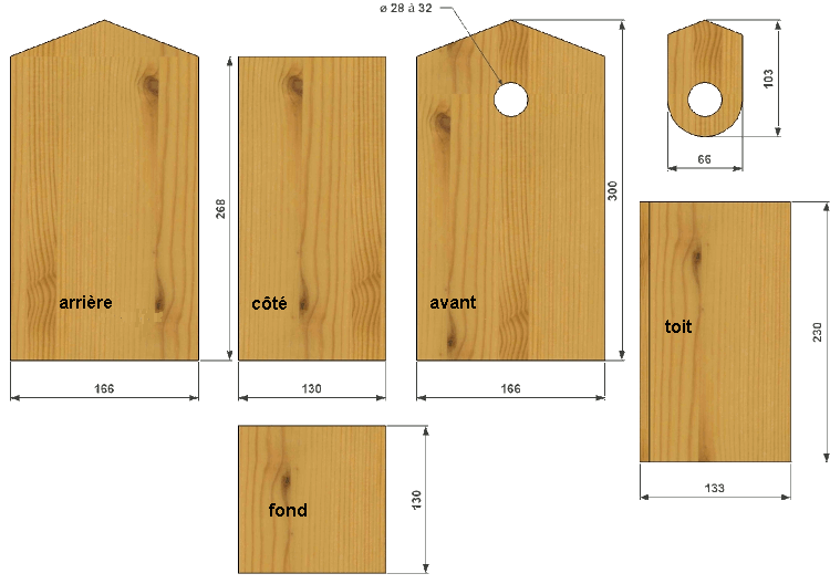 Il est impossible de fournir un plan coté d'un nichoir en dosses puisque l'épaisseur et la forme du matériau sont variables. Il faut, cependant, lors de sa fabrication, respecter au mieux les dimensions intérieures indiquées dans la rubrique " dimensions des nichoirs".