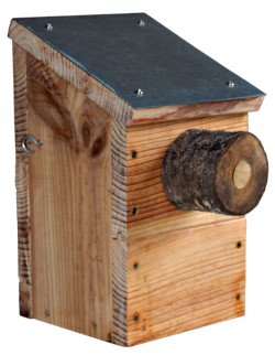Le modèle de droite est pourvu d'un trou d'envol circulaire d'un diamètre de 28 à 32mm selon l'espèce que l'on désire accueillir (voir rubrique " dimensions des nichoirs").
