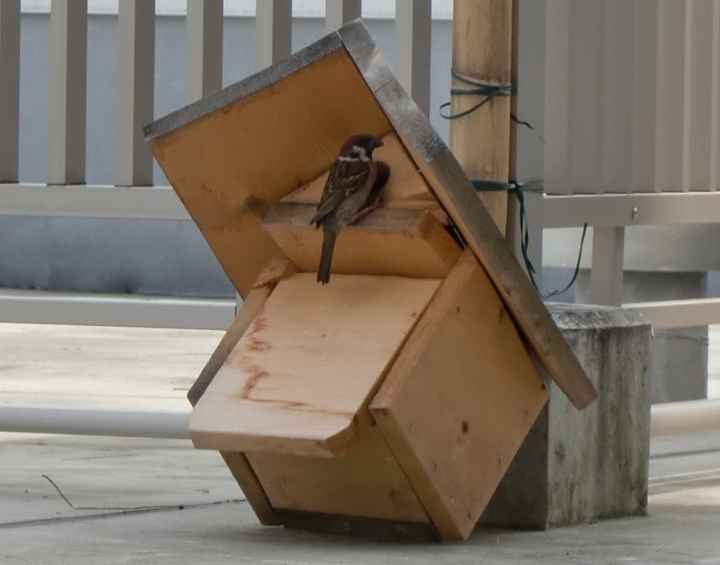 Un couple de Moineaux friquets, espèce beaucoup plus anthropophile dans l'Est asiatique qu'en Europe, y avait élu domicile.