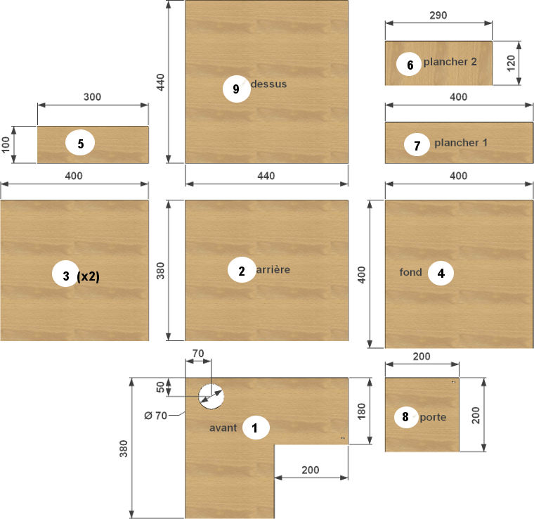 Nichoir constitué de deux rondelles de bois de Ø 150, dont l’une est percée du trou d’envol de Ø 70, et de liteaux (section 25 x 25). L’ensemble est cerclé au moyen de deux morceaux de fil de fer.