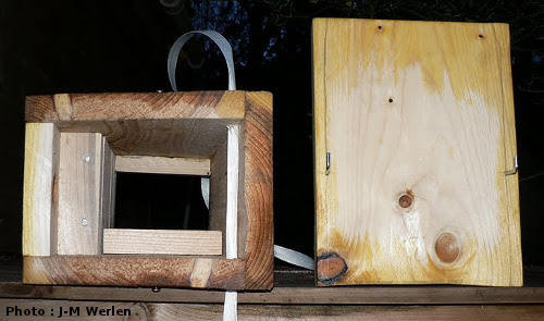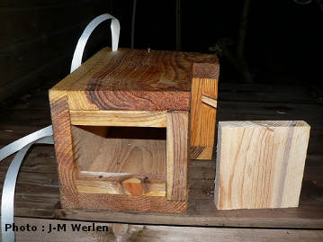 - un système de fixation à l'aide d'une cordelette passant par deux trous pratiqués dans les côtés du nichoir.