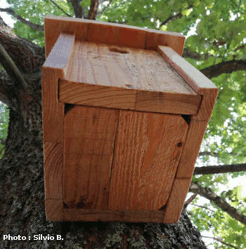 On remarquera que les angles de la pièce du fond ont été coupés de facçon à évacuer l'humidité éventuelle de la chambre de ponte et que le lien qui fixe le nichoir au tronc de l'arbre est isolé de celui-ci afin de lui éviter des blessures.